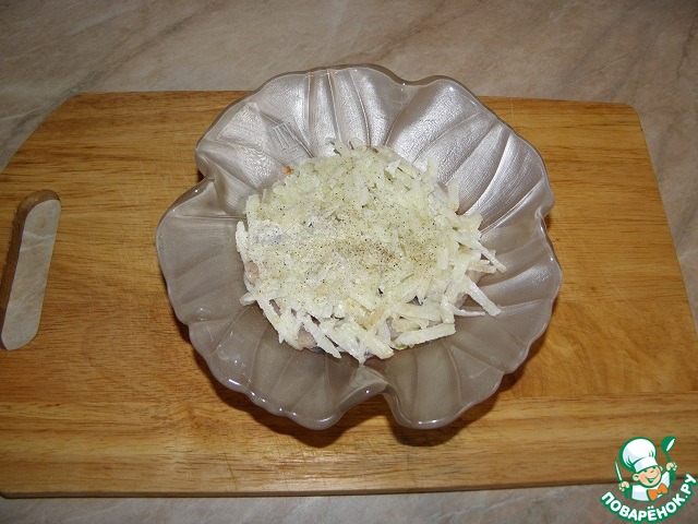 Второй слой кладем редьку, солим, перчим, смазываем майонезом