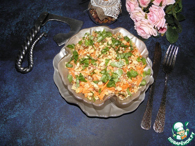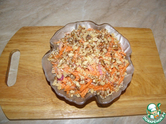 Верх салата посыпаем рублеными орехами, накрываем пищевой пленкой, отправляем настояться в холодильник. минимум на 3 часа! Лучше 4-5