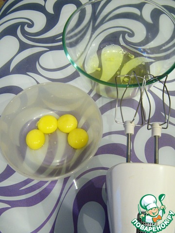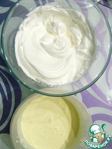 Взбиваем желтки в течение 7 минут до однородности, затем по 1 ч. л. вводим половину сахара. Не прекращаем взбивать! Сахар должен раствориться в желтках.
