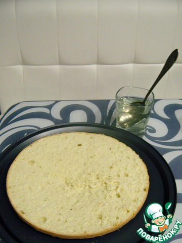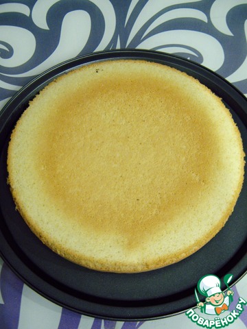 Вынимаем бисквит из духовки и извлекаем его из формы. Чтобы избежать выпуклости на бисквите, переворачиваем его. Даём остыть.