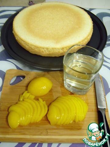Пока бисквит остывает нарезаем консервированные персики на дольки. Сироп от персиков переливаем в стакан (это наша пропитка для бисквита). Сироп из одной консервы на один корж.