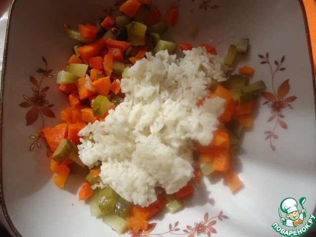 Рис отварить до готовности, в салатник выложить нарезанные овощи, добавить рис.