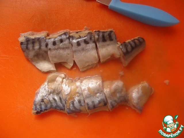 Воду смешать с уксусом, залить скумбрию и оставить на 1 час. По истечении времени слить раствор через дуршлаг.