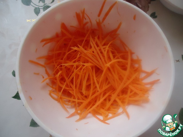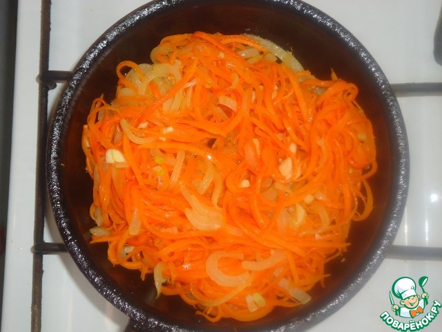 Пережарить лук, морковь и мелко нарезанный чеснок.