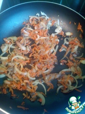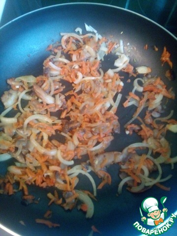 Режим лук, морковку трем на крупной терке. В сковороду наливаем подсолнечное масло. Обжариваем лук, морковь и грибы до готовности.