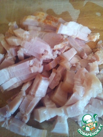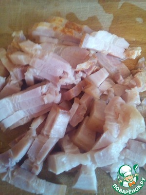 - Грудинка (На самом деле можно брать любое мясо, в том числе колбасу или сосиски. По рецепту идет грудинка.) — 200 г