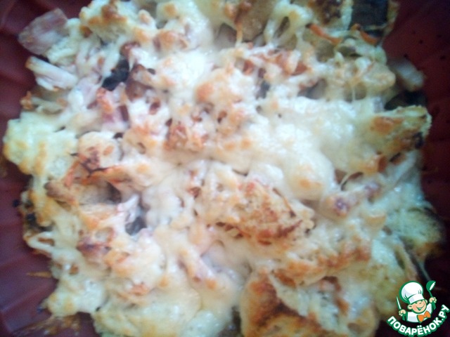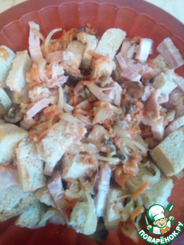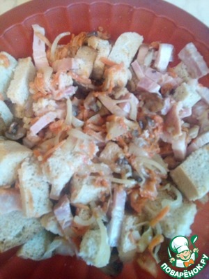 Берем форму для запекания. У меня силиконовая, поэтому я ее не смазывала. Если берете другую форму, обязательно нужно смазать маслом. Смешиваем наши ингридиенты: грибы с луком и морковкой, грудинку и хлеб.
