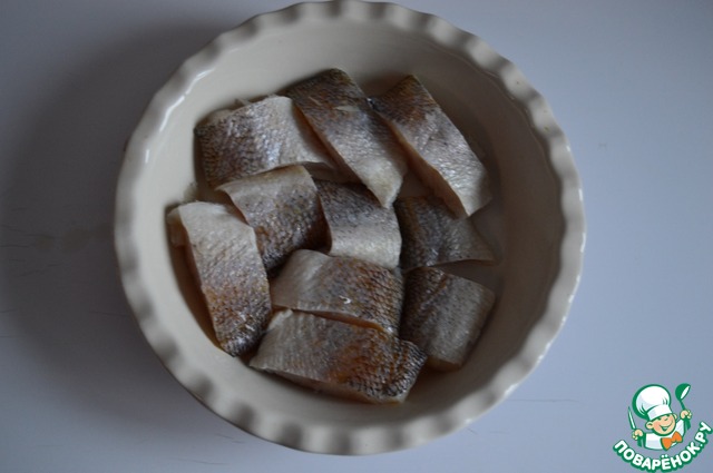 Рыбу очистить от костей, нарезать порционными кусочками, выложить в форму для запекания. Рыбу посолить.