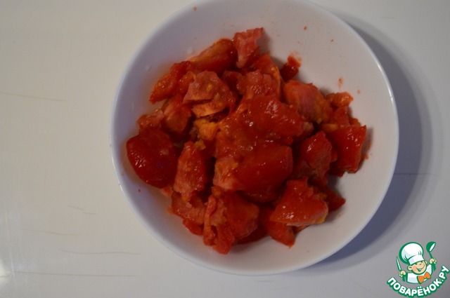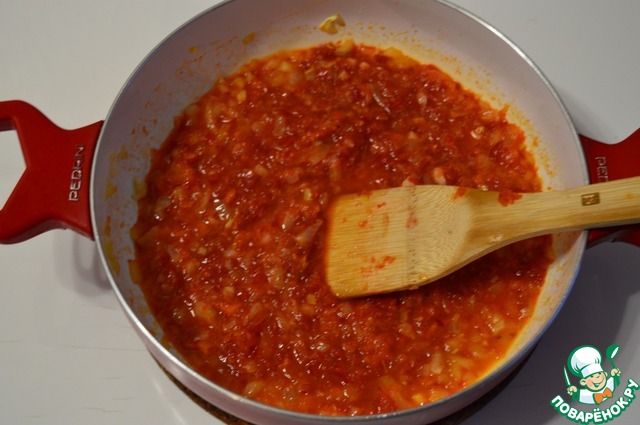 Добавить помидоры и перец к луку, немного потушить, избавляясь от лишнего сока.