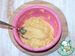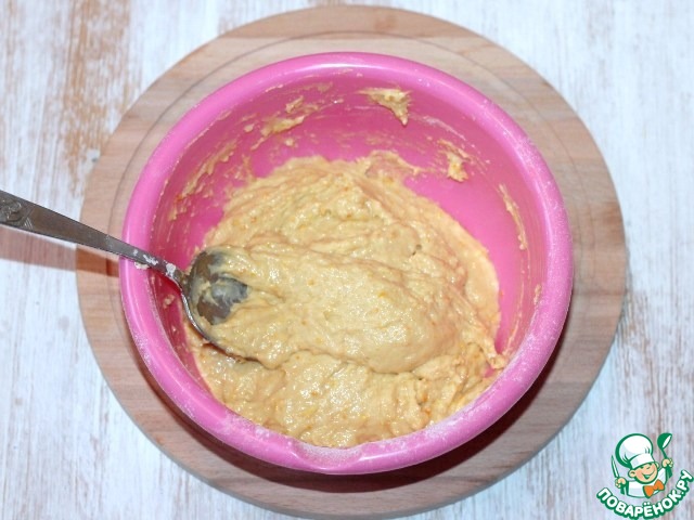 6. Добавляем в жидкую апельсиновую смесь по 1 ст. л. муки. Замешиваем густое, липнущее тесто, оно с трудом падает с ложки. Включаем духовку на t 180 С.