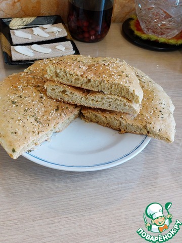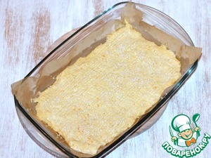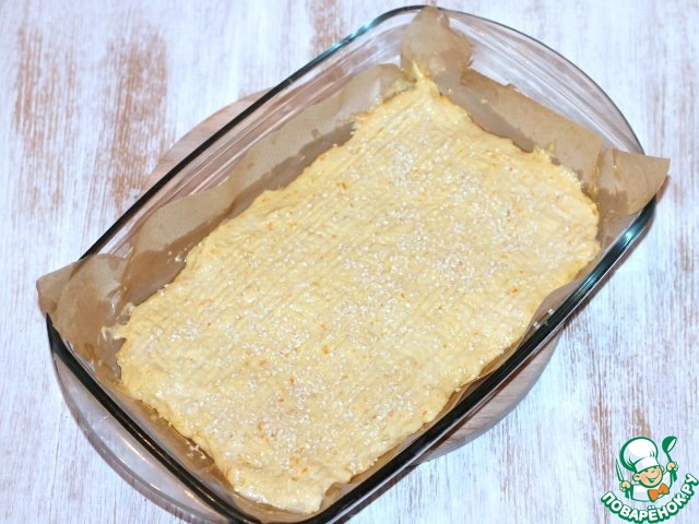 7. Застилаем противень (28*19) бумагой для выпечки и смазываем растительным маслом. Выкладываем и равномерно распределяем тесто. Посыпаем кунжутом. Чтобы красивее разровнять верх пирога, лучше взять мокрую силиконовую лопатку.