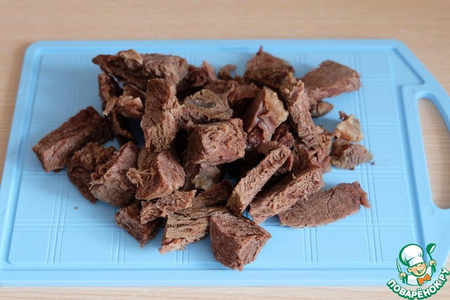 Мясо готово. Из бульона достать мясо, нарезать кусочками, косточки удалить.