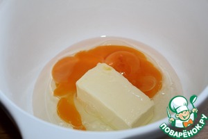 Остальной сахар, сливочное масло, щепотку ванилина, яйцо, желтки и соль взбить.