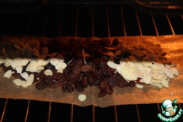 В теплую духовку положить 3 ст л миндаля и изюм - на 5 минут.