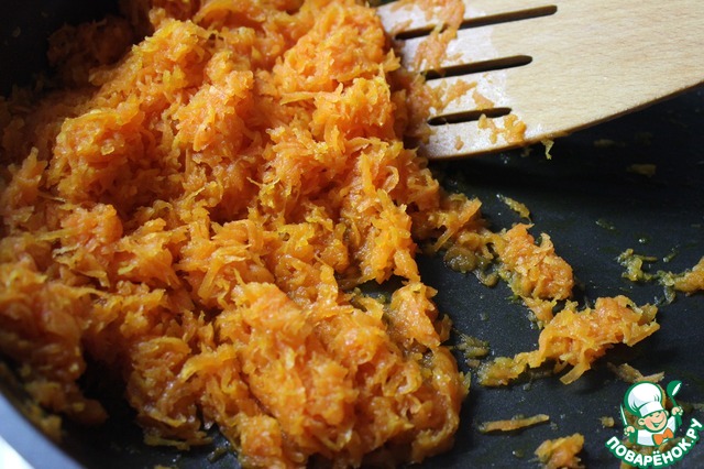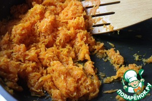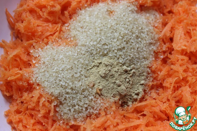 2. Морковь натираем на мелкой терке, добавляем сахар и имбирь.