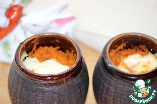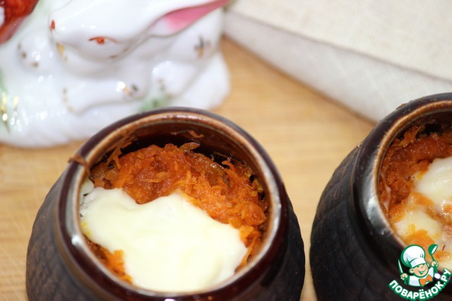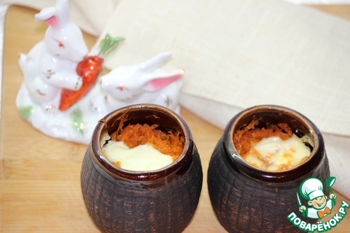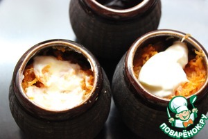 5. Складываем морковь в керамические горшочки, положив сверху сметану.