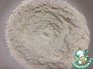 Соевый соус смешать с растительным маслом и горячей кипяченой водой, вылить в муку.