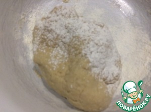 Замесить тесто. Сначала лопаткой, а затем руками. Сразу всю муку высыпать не надо, чтобы не "забить" тесто. Тесто получится мягкое, эластичное, кремового цвета.