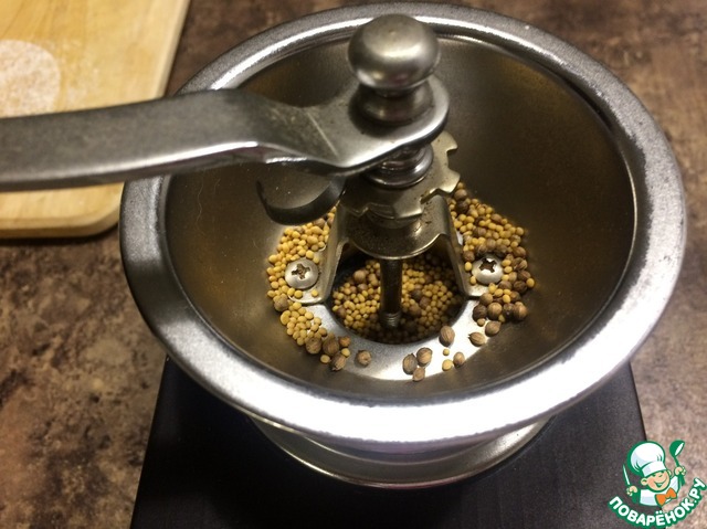 Кориандр и семена горчицы перемолоть в ступке или мельнице. -