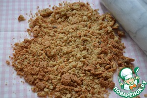 Печенье растолочь скалкой между двумя слоями полотенца. Вы, конечно, можете сделать это в блендере. Но когда попадаются разные по размеру кусочки печенья, мне кажется, так интереснее.