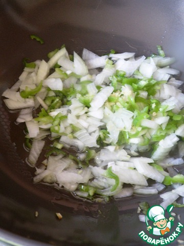 Очистить и мелко нарубить лук и свежий перец. Имбирь нарубить совсем мелко. В горячем масле слегка притомить овощи.