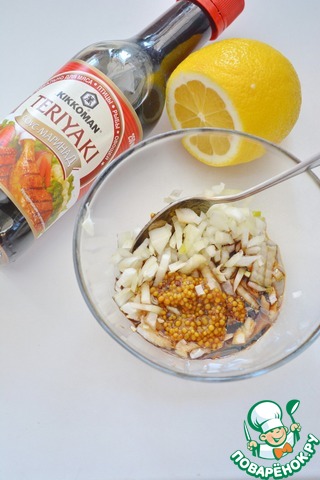 Для маринада смешайте мелко нарезанный лук с зернистой горчицей, растительным маслом, лимонным соком и соусом Терияки (у меня неизменно соус Киккоман)