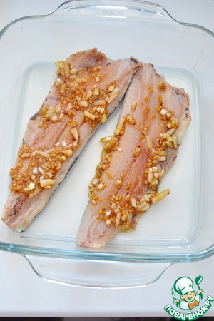 Поместите филе сельди в форму для запекания, полейте маринадом с двух сторон, оставьте мариноваться на 15 минут -