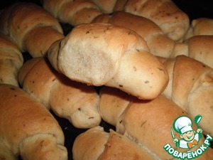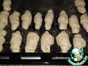 Посыпав поверхность листа отрубями, укладываем "ровными рядами", оставляем для расстойки на 10-15 минут, отправляем в духовку нагретую до 100-150 градусов, через 10 минут температуру прибавить до 200 градусов.