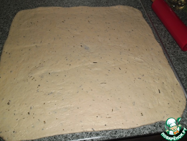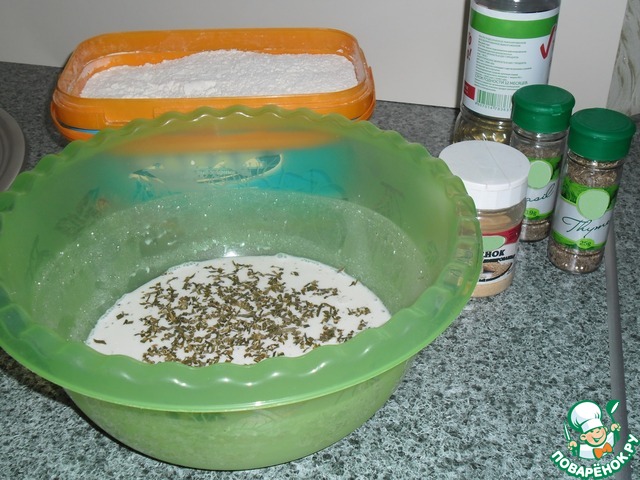 Развести дрожжи в теплой воде, добавить соль и сахар. Добавить не много муки, размешать, теперь добавить сухие зеленый лук, тимьян и базилик, чеснок, хорошо перемешать.