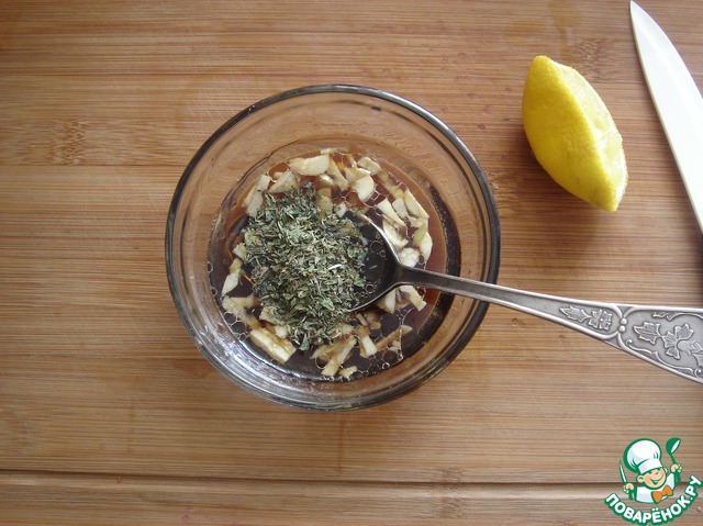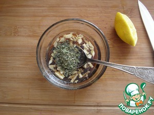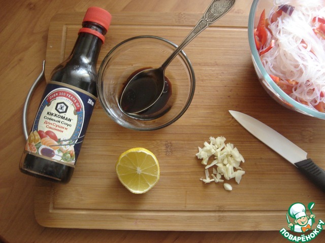 Делаем заправку. Чеснок мелко рубим. В посуде смешиваем масло+соевый соус+лимонный сок свежевыжатый из половинки лимона+жидкость из-под запаривания фунчозы 2 ст л.