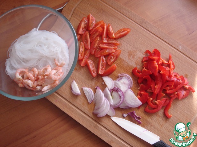Креветки отвариваем в подсоленной воде. Чистим и выкладываем в салатник. Туда же отправляем фунчозу. Черри режем четвертинками, перец красный болгарский -тонко, лук-полу-кольцами. Всё отправляем в салатник.