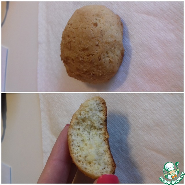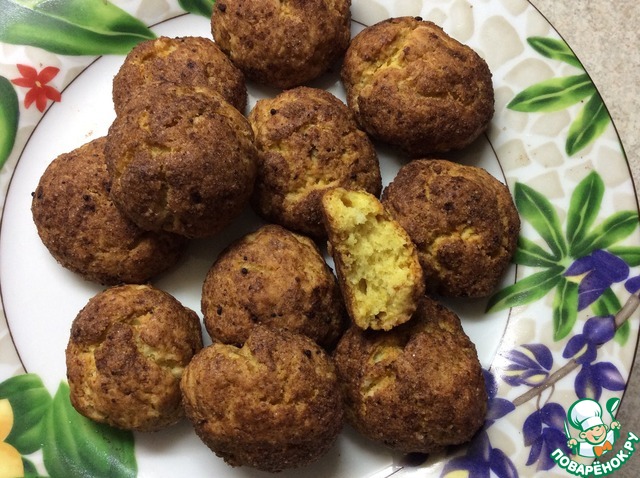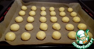 Сформировать из теста шарики величиной с грецкий орех и выложить их на противень, застеленный бумагой для выпечки. Ставим в разогретую до 190 град. духовку и выпекаем 10 мин, потом еще 5 минут с конвекцией.