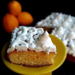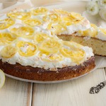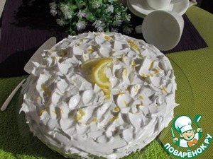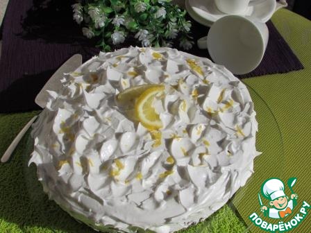 Нанести белковый крем на пирог с помощью лопатки. Украсить долькой лимона и цедрой.