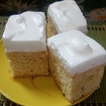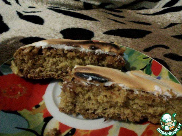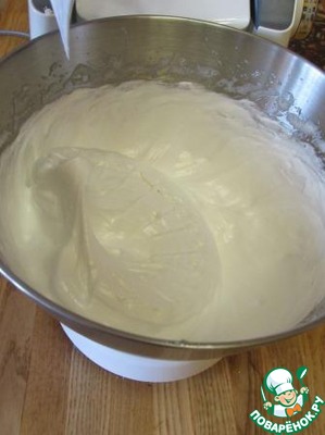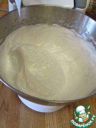 Пока пирог будет пропитываться, готовим украшение из белкового крема. Белки взбить в густую пену на низких оборотах, добавить 1 ст. ложку лимонного сока. Всыпать сахар взбить до устойчивых пиков.