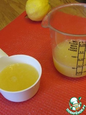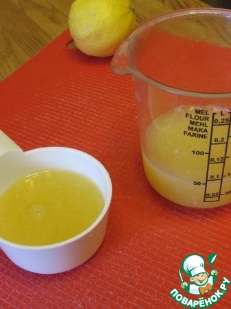 Из лимонов выжать сок. Сока должно быть не менее 100 мл. Разделить количество сока пополам, отмерить 1 ст. ложку в отдельную посуду (для взбивания с белками).