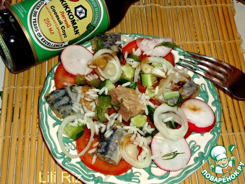 Салат предельно прост в приготовлении, овощи необходимо нарезать произвольно, рыбу на кусочки также произвольного размера, рис отварить в подсоленной воде.