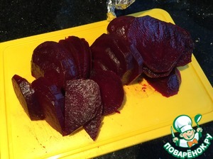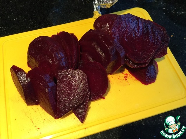 Готовую свеклу остудите, почистите и тонко нарежьте.