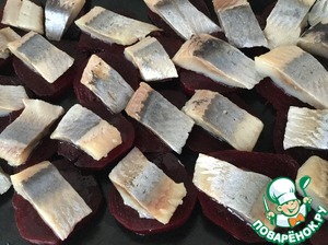 Выложите на тарелку свеклу, сверху выложите кусочки селедки.