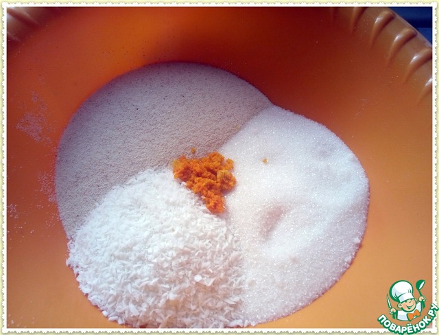 Манную крупу смешать с сахаром, кокосовой стружкой, цедрой.