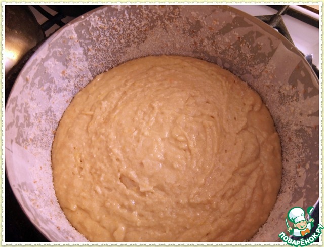 Бока и дно формы для выпечки смазать растительным маслом, присыпать манкой или панировочными сухарями, можно застелить промазанной маслом бумагой для выпечки, а потом обсыпать сухарной крошкой или манкой.