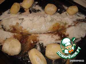 Время выпекания зависит от величины вашей рыбы. Главным показателем, что рыба готова, служит затвердение корки на рыбе (можно проверить, постучав по рыбе ножом). Соль местами желтеет и даже коричневеет.