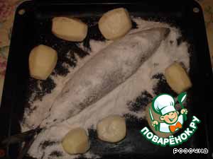 На гарнир можно запечь картошку. Для этого очищаем картофель, натираем солью и выкладываем рядом с рыбкой. Ставим рыбу в духовку.