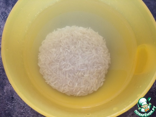 Промыть рис и замочить его в холодной воде на полчаса.