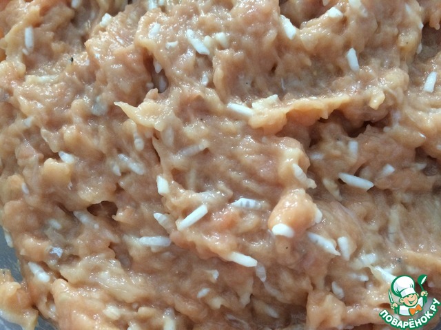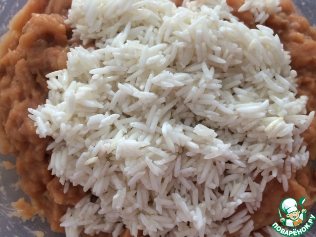 С риса слить воду, добавить в фарш.