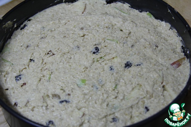 Добавить "сухую" смесь к масляной и перемешать до однородного состояния на низкой скорости. Если необходимо, добавьте овсянки. Я не рискнула "забивать" и тесто не "выкладывала", а "намазывала" в форме.