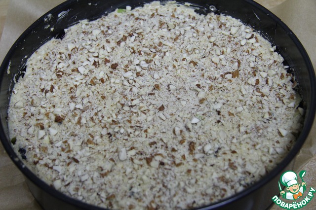 Выложить 2/3 смеси на дно формы, застеленной бумагой для выпечки. Будьте внимательны (!) пирог очень хрупкий и на бумаге его проще будет перекладывать.