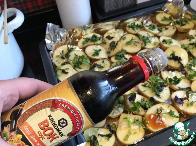 Полейте каждую половинку картофеля соусом ВОК для жарки ТМ KIKKOMAN.