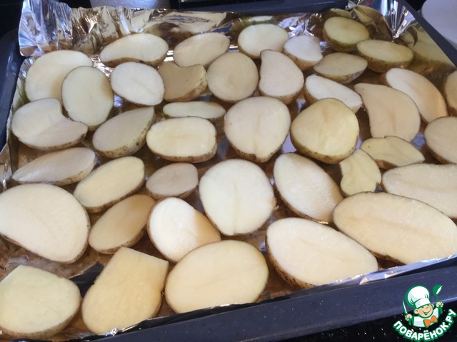 Картофель хорошо вымыть щеткой, разрезать на половинки и выложить на противень, застеленный фольгой.