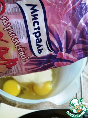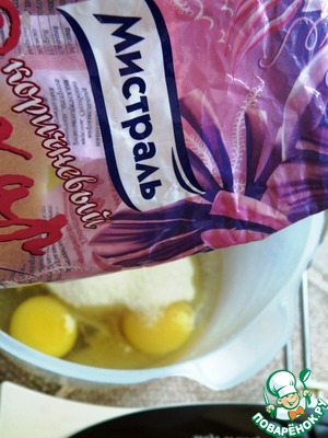 Для коржа взбить яйца с сахаром – я брала мелкий ТМ «Мистраль» - отлично идет для выпечки – в пышную белую пену. Постепенно вливая масло, взбить в крем.