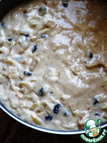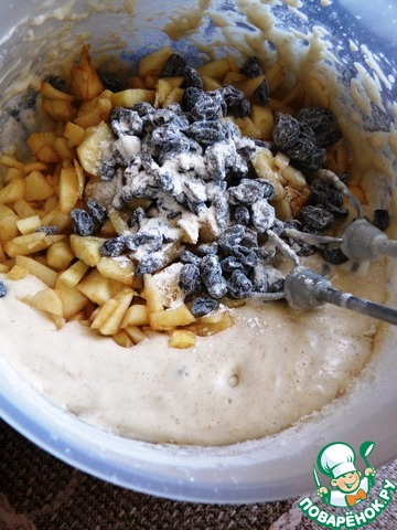 Добавить муку, дважды просеянную с крахмалом и разрыхлителем, ванилин. Легко перемешать. Добавить очищенные и мелко нарезанные яблоки и промытый, обсушенный и обваленный в муке изюм.
